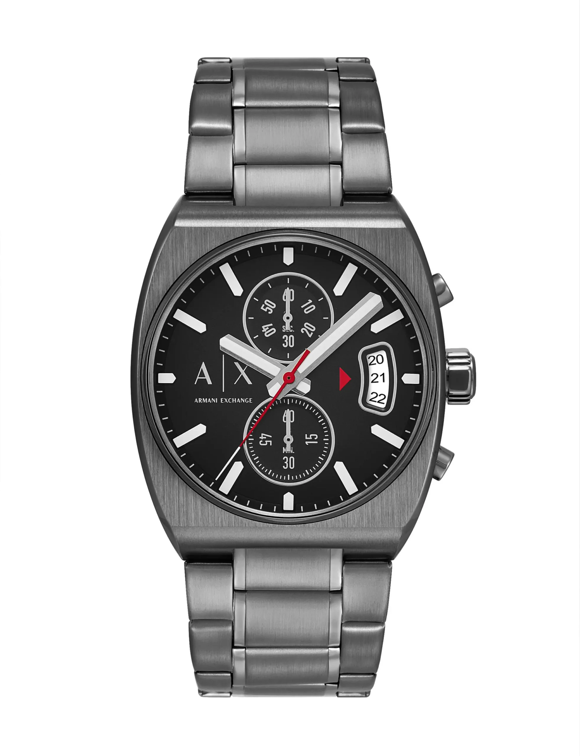 A 40mm, cushion-shaped case frames the rich green sunray dial of this Emporio Armani watch with a quartz chronograph movement. Complemented by a gunmetal-tone stainless steel bracelet with both brushed and polished finishing and a date window at 6 o’clock, this watch is the perfect contemporary execution of vintage flair.